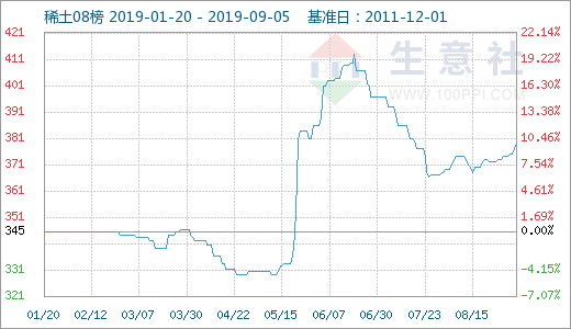 中國(guó)粉體網(wǎng)訊 9月5日稀土指數(shù)為379點(diǎn),較昨日上升了2點(diǎn),較周期內(nèi)最高點(diǎn)1000點(diǎn)(2011-12-06)下降了62.10%,較2015年09月13日最低點(diǎn)271點(diǎn)上漲了39.85%。(注:周期指2011-12-01至今)。