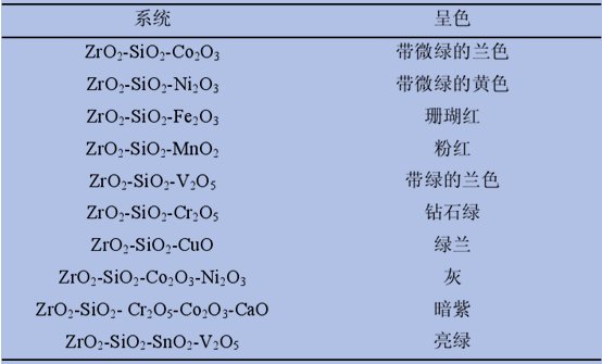 許多過(guò)渡金屬的氧化物或氟化物進(jìn)入ZrO2-SiO2晶格時(shí),能形成呈色結(jié)構(gòu)物。過(guò)渡金屬氧化物或氟化物在其中起呈色成分的作用。這些過(guò)渡金屬元素是鐵、鉻、錳、鉆、鎳、銅、釩、鉬、銀、金等。