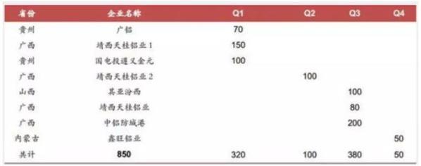 2020年Q1-Q4中國(guó)氧化鋁預(yù)計(jì)新增產(chǎn)能(萬(wàn)噸)
