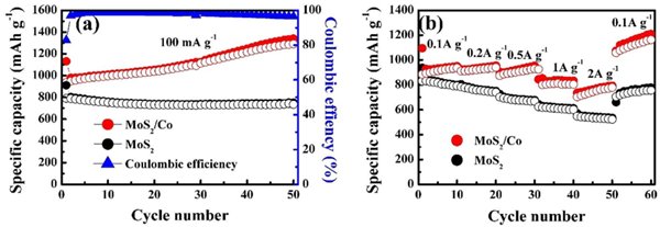 圖1. MoS2/Co復(fù)合材料的循環(huán)和倍率性能。