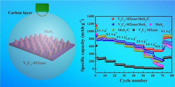 圖2. V4C3-MXene/MoS2/C復(fù)合材料的結(jié)構(gòu)示意圖和倍率性能。