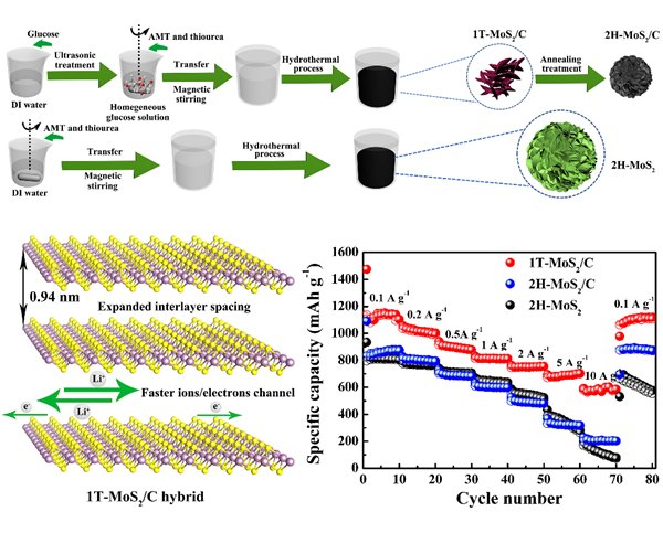 與石墨相比,具有二維/準(zhǔn)二維晶體結(jié)構(gòu)的材料由于具有相對安全的工作電壓,較大的比表面積、較為豐富的活性位點(diǎn)以及快速的離子/電子轉(zhuǎn)移能力,可被應(yīng)用于鋰離子電池負(fù)極材料。作為二維材料的典型代表,MoS2具有類石墨烯層狀結(jié)構(gòu)和高理論比容量 (669 mAh/g)。然而,MoS2作為LIBs負(fù)極材料時存在如因材料導(dǎo)電性不好引起的倍率性能不佳、循環(huán)過程中因體積變化大引起穩(wěn)定性能差等不足。為解決上述問題,課題組對MoS2電極材料開展了改性研究,獲得了具有較優(yōu)越電化學(xué)性能的MoS2電極材料。