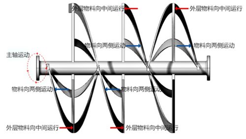 臥式螺帶混合機(jī)混合部件有內(nèi)外螺帶,外螺旋帶在動力的驅(qū)動下其螺旋機(jī)構(gòu)配合旋轉(zhuǎn)方向把物料從簡體兩端向中央地帶推動,而內(nèi)螺旋帶把物料從中間向兩端推動,形成對流混合;旌蠙C(jī)臥式筒體底部出料口,外螺帶的螺旋結(jié)構(gòu)配合主軸旋轉(zhuǎn)方向推動筒壁內(nèi)側(cè)物料至出料口出料。