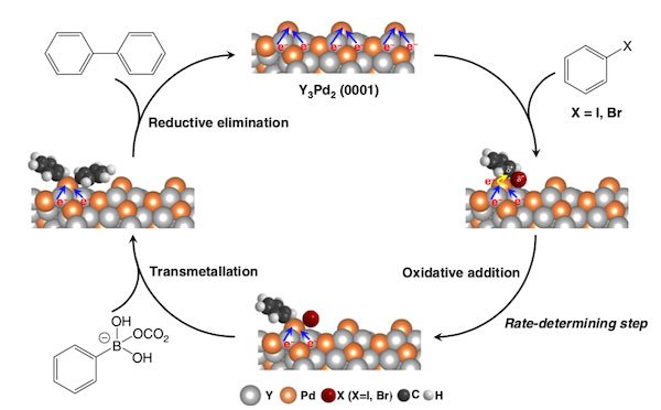 據(jù)文章第一研究作者東京理工大學(xué)元素策略材料研究中心助理教授葉天南解釋說,根據(jù)理論計算,Y3Pd2被認(rèn)為是有效的選擇。他說:“在一種電子化合物中,陰離子電子被困在間隙位置,通常具有很強的電子捐贈作用。這一特征促使我們將Y3Pd2作為鈴木偶聯(lián)反應(yīng)催化劑,因為決速步驟的反應(yīng)勢壘可通過電子從駐極體轉(zhuǎn)移到基板來抑制!