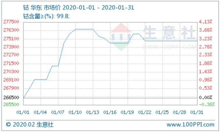根據(jù)生意社數(shù)據(jù)監(jiān)測顯示:1月鈷價震蕩上漲,鈷市行情回暖,鈷價上漲。截止1月31日,鈷價報價274833.34元/噸,較月初鈷價報價均價266500.00元/噸上漲,漲幅3.13%。