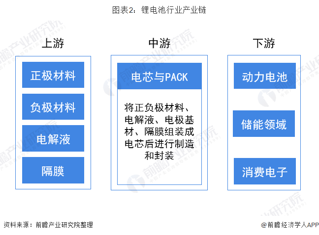 鋰電池行業(yè)產(chǎn)業(yè)鏈的上游主要為正負(fù)極材料、電解液、電極基材、隔膜等的供應(yīng)商;中游為電芯制造及封裝行業(yè);下游是鋰電池的應(yīng)用領(lǐng)域,主要應(yīng)用于動(dòng)力電池、消費(fèi)電子等多個(gè)領(lǐng)域。