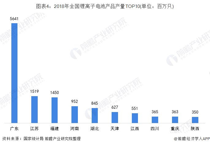 2018年,我國(guó)鋰電池產(chǎn)量前十的地區(qū)分別為,廣東、江蘇、福建、河南、湖北、天津、江西、四川、重慶和陜西。廣東省鋰電池產(chǎn)量全國(guó)第一,約56億只,占全國(guó)總產(chǎn)量的40%左右。