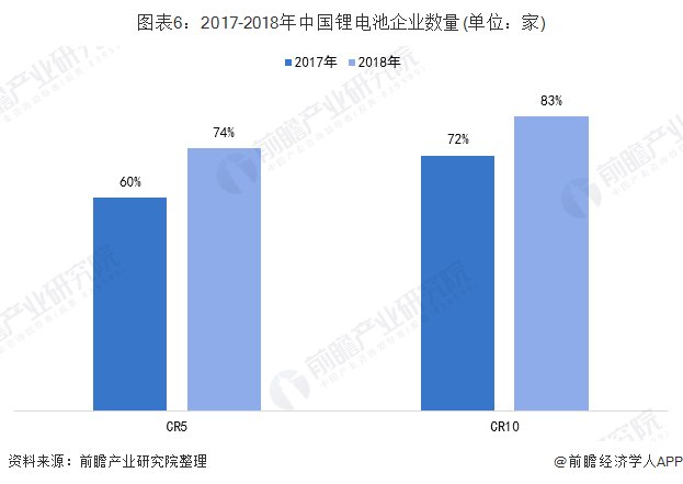 從我國(guó)動(dòng)力鋰電池CR5和CR10的裝機(jī)量情況來(lái)看,我國(guó)動(dòng)力鋰電池市場(chǎng)的集中度較高,2018年我國(guó)動(dòng)力鋰電池CR5為74%,CR10達(dá)到83%,較2017年進(jìn)一步提高。