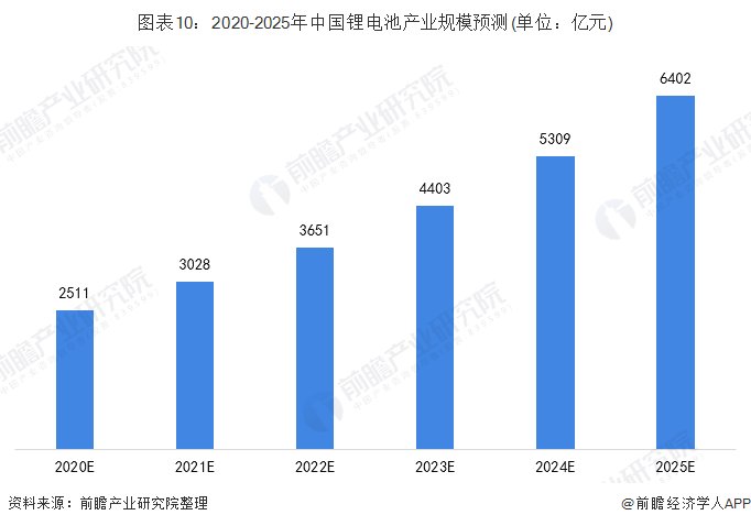 圖表10:2020-2025年中國(guó)鋰電池產(chǎn)業(yè)規(guī)模預(yù)測(cè)(單位:億元)