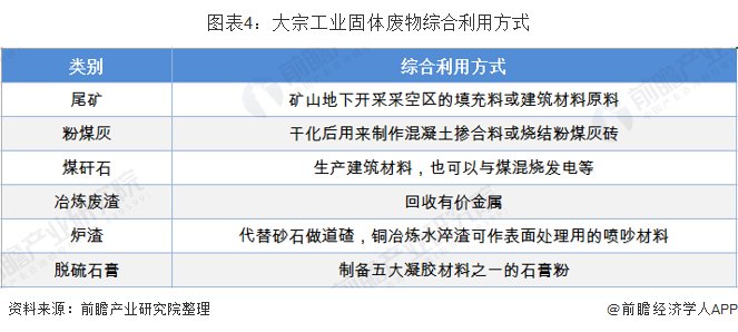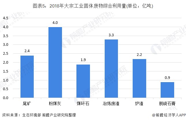 根據(jù)生態(tài)環(huán)境部統(tǒng)計數(shù)據(jù),2018年大宗工業(yè)固體廢物綜合利用量分別為尾礦2.4億噸、粉煤灰4.0億噸、煤矸石1.9億噸、冶煉廢渣3.3億噸、爐渣2.2億噸、脫硫石膏0.9億噸。