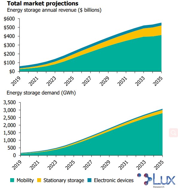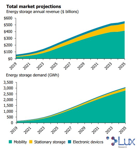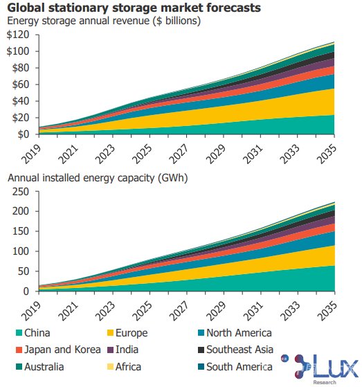 在Lux兩年一次的市場(chǎng)預(yù)測(cè)報(bào)告的2019年版中,我們發(fā)現(xiàn),到2035年,整個(gè)能源存儲(chǔ)市場(chǎng)的年收入將增長(zhǎng)到5460億美元,年度部署將達(dá)到3046億千瓦時(shí)。到2035年,人口流動(dòng)仍然是能源儲(chǔ)存年度收入和需求的長(zhǎng)期驅(qū)動(dòng)因素,總市場(chǎng)份額按年收入計(jì)算為74%,按需求計(jì)算為91%。與此同時(shí),固定存儲(chǔ)市場(chǎng)將在2023年超過(guò)電子設(shè)備市場(chǎng),Lux預(yù)計(jì)屆時(shí)它將成為一個(gè)價(jià)值300億美元、裝機(jī)容量為52千瓦時(shí)的產(chǎn)業(yè)。