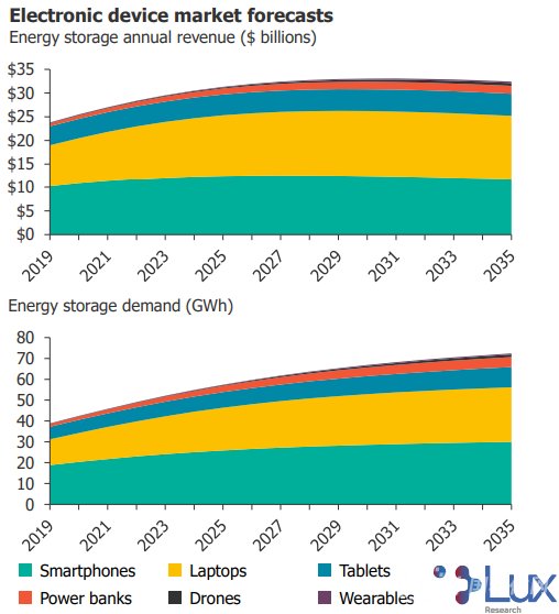 電子產(chǎn)品:筆記本電腦、手機(jī)和無(wú)人機(jī)是最成熟的能源存儲(chǔ)市場(chǎng)。許多此類設(shè)備年銷量已經(jīng)趨于穩(wěn)定,瞄準(zhǔn)這些市場(chǎng)的電池公司幾乎沒(méi)有什么增長(zhǎng)機(jī)會(huì)。