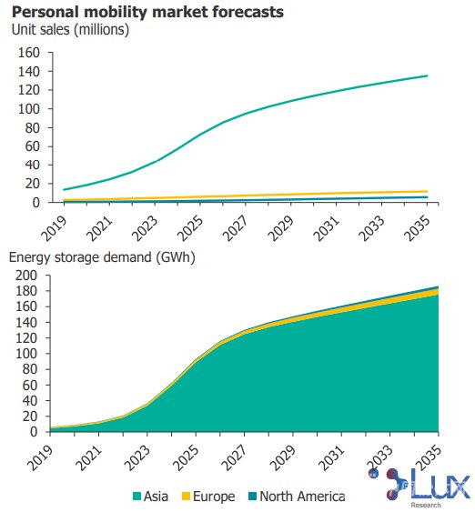 中國(guó)的電動(dòng)摩托車和自行車市場(chǎng)每年已經(jīng)超過(guò)3000萬(wàn)輛,盡管其中大部分仍然是鉛酸電池(Lux的預(yù)測(cè)只考慮鋰離子電池)。中國(guó)的增長(zhǎng)將來(lái)自于向鋰離子電池的轉(zhuǎn)變。