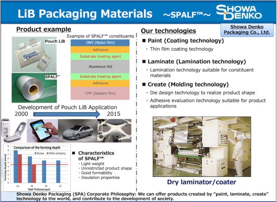 軟包電池的形狀非常靈活,因而可用于智能手機(jī)、平板電腦等各種小設(shè)備。此外,近年來(lái),軟包鋰離子電池因質(zhì)量高,受到了廣泛認(rèn)可,而且在驗(yàn)證安全性方面也取得了較大進(jìn)展,因而也開始廣泛應(yīng)用于電動(dòng)汽車等大型設(shè)備。而中國(guó)、歐洲等國(guó)家的電動(dòng)汽車不斷發(fā)展,導(dǎo)致對(duì)軟包鋰離子電池的需求增加。因此,昭和電工株式會(huì)社研發(fā)了該款用于大尺寸軟包鋰離子電池的SPALF鋁塑復(fù)合膜。
