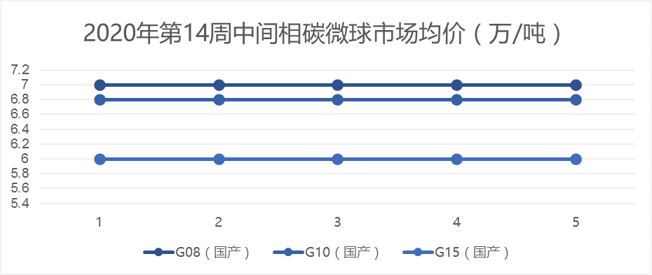第14周中間相碳微球市場報價與上周價格持平,具體均價:G08(國產(chǎn))均價7萬/噸,G10(國產(chǎn))均價6.8萬/噸,G15(國產(chǎn))均價6萬/噸。