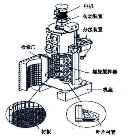 塔式磨機(jī)主要由螺旋攪拌器、筒體、機(jī)架、傳動(dòng)裝置、電機(jī)、分級(jí)裝置等構(gòu)成,筒壁及攪拌葉片上安裝有耐磨襯板,并配有檢修門,分級(jí)裝置主要是對(duì)溢流出的礦料進(jìn)行分級(jí),對(duì)未達(dá)標(biāo)的物料進(jìn)行回磨再磨。
