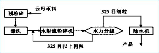 水射流粉碎工藝占地面積小、設(shè)備簡(jiǎn)單、操作簡(jiǎn)便,由于水射流具有良好的解離性及水射流粉碎機(jī)可直接采用水力分級(jí),將雜質(zhì)、粗粒與合格的細(xì)粒分離,因而大大地簡(jiǎn)化了云母粉生產(chǎn)工藝,提高了云母粉的質(zhì)量。
