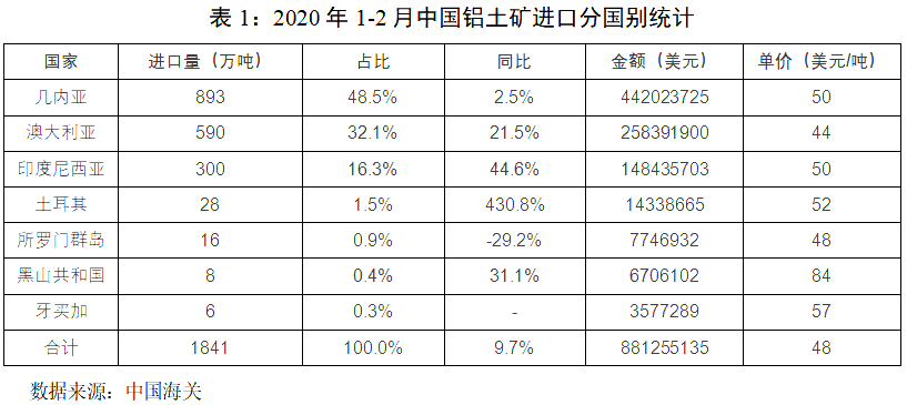 2019年中國(guó)鋁土礦進(jìn)口依存度上升至53%的高位,幾內(nèi)亞、澳大利亞和印度尼西亞是中國(guó)主要的鋁土礦進(jìn)口來(lái)源。