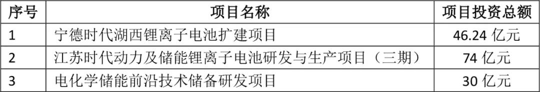 根據(jù)寧德時代規(guī)劃,公司計劃分別投資46.24億元、74億元和30億元建設(shè)寧德時代湖西鋰離子電池擴建項目、江蘇時代動力及儲能鋰離子電池研發(fā)與生產(chǎn)項目(三期)和電化學(xué)儲能前沿技術(shù)儲備研發(fā)項目,其中使用募集資金115億元。