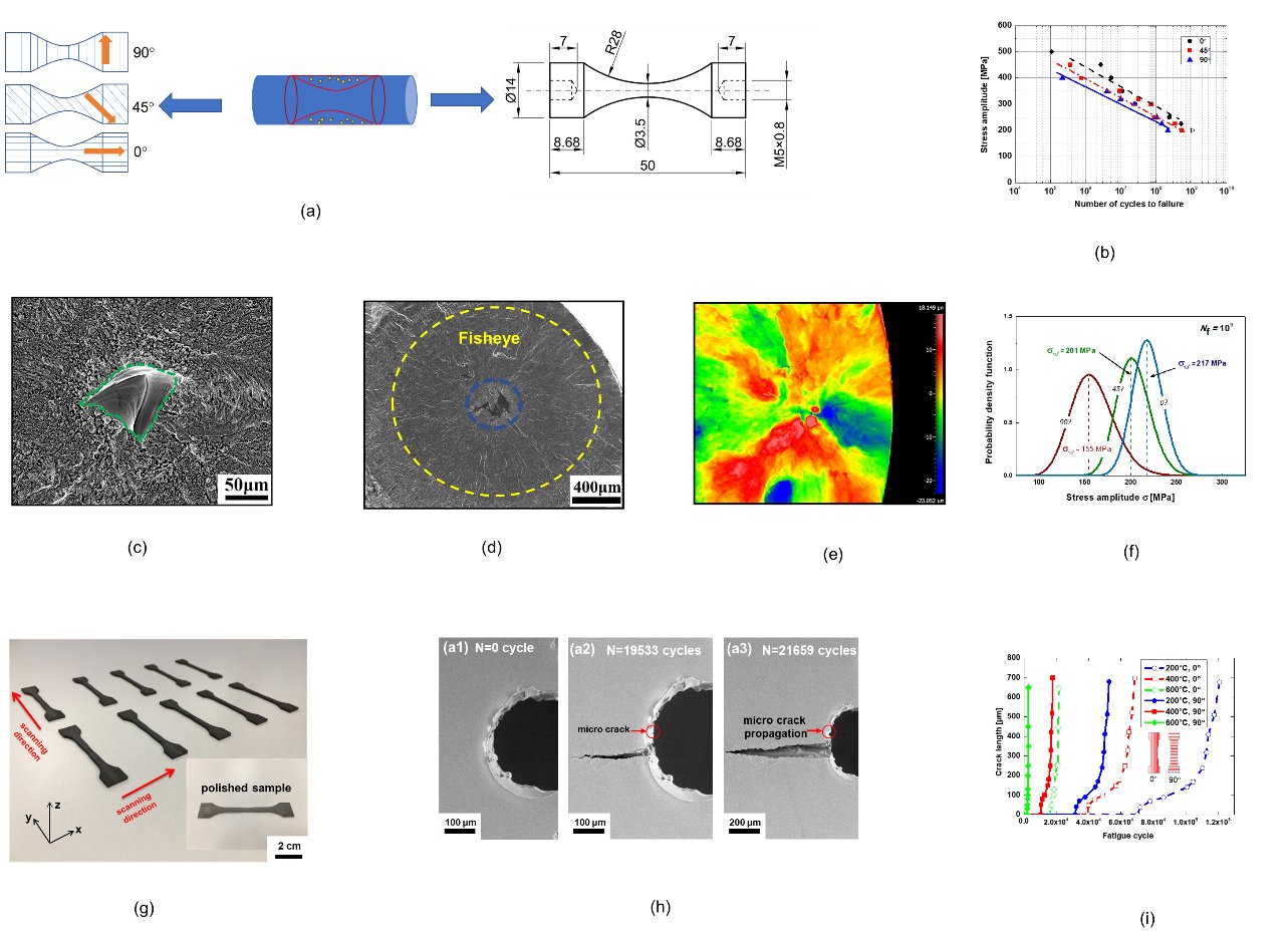 圖:增材制造Ti-6Al-4V材料高周、超高周疲勞及不同溫度下疲勞裂紋擴(kuò)展性能 (a) 高周、超高周疲勞測(cè)試試樣 (b) S-N曲線 (c) 裂紋源 (d) “魚(yú)眼狀”斷口形貌 (e) 裂紋源粗糙度 (f) 超高周疲勞強(qiáng)度統(tǒng)計(jì)分布 (g) 裂紋擴(kuò)展原位測(cè)試試樣 (h) 裂紋擴(kuò)展形貌 (i) 不同溫度下、不同制備取向試樣,裂紋長(zhǎng)度隨疲勞周次變化。