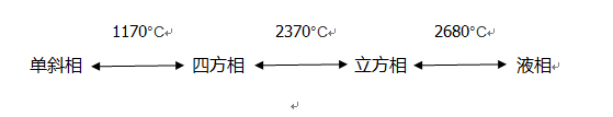 ZrO2有三種晶體結(jié)構(gòu),單斜相(常溫穩(wěn)定型,密度5.68g/cm3)、四方相(密度6.1g/cm3)、立方相(密度6.27g/cm3)。三種晶型可以相互轉(zhuǎn)變,轉(zhuǎn)變溫度與雜質(zhì)含量有關(guān),在ZrO2純度高時,三種晶型能發(fā)生以下同質(zhì)異晶轉(zhuǎn)變: