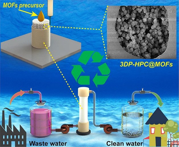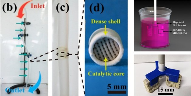 基于此,中國科學(xué)院蘭州化學(xué)物理研究所研究員王曉龍團隊與蘭州大學(xué)副教授周林成團隊合作,結(jié)合3D打印技術(shù)在復(fù)雜器件構(gòu)筑及自由設(shè)計、制造與成型等領(lǐng)域的優(yōu)勢,開展了3D打印MOFs修飾的多孔陶瓷催化材料與器件研究,用于水體有機污染物催化降解(圖1)。