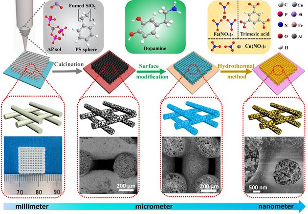 如圖2所示,研究人員首先研發(fā)了由磷酸鋁溶膠(AP)、親水性氣相SiO2和聚苯乙烯微球(PS)組成的3D打印陶瓷墨水,其中PS微球用于調(diào)節(jié)3D打印陶瓷的孔隙度;然后,用墨水直書寫(DIW)3D打印技術(shù)擠出成型,并經(jīng)高溫煅燒后獲得高精度的三維多級多孔陶瓷骨架;最后,通過聚多巴胺表面修飾和水熱法處理技術(shù),在3D打印的多級多孔陶瓷骨架上原位生長MOFs顆粒,從而制備出具有結(jié)構(gòu)可調(diào)性、高催化活性、長期穩(wěn)定性以及易于器件化的MOFs修飾的3D打印多級多孔催化劑。