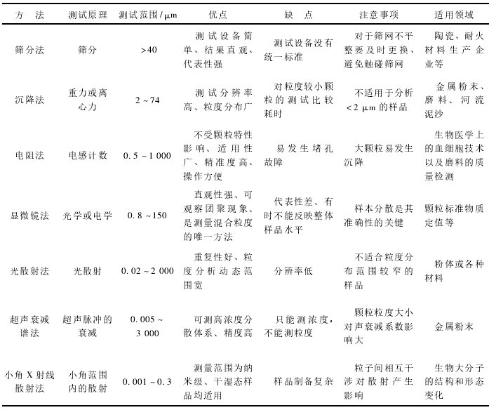 顆粒的大小和尺寸分布參數(shù)與顆粒的特性密切相關(guān),同時(shí)也是顆粒材料的生產(chǎn)制備以及應(yīng)用中離不開(kāi)的一個(gè)重要環(huán)節(jié)。目前,國(guó)內(nèi)外對(duì)顆粒測(cè)試技術(shù)進(jìn)行深入研究并不斷取得進(jìn)展。顆粒測(cè)試技術(shù)是對(duì)顆粒粒度及其分布等參數(shù)進(jìn)行表征的不同顆粒測(cè)試方法的統(tǒng)稱,依據(jù)原理不同主要包括篩分法、沉降法、電阻法、顯微鏡法、光散射法、超聲衰減譜法及小角X射線散射法。其中粒度,即顆粒尺寸大小是顆粒測(cè)試技術(shù)表征顆粒主要參數(shù),顆粒按粒度大小分為納米顆粒、亞微米顆粒、微粒、微粉、細(xì)粒、細(xì)粉和粗粒;诓煌淼念w粒測(cè)試方法采用不同等效參考量 (即等效粒度) 進(jìn)行顆粒表征。