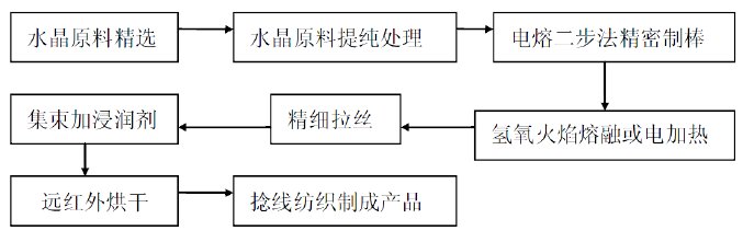 首先將原料水晶或純凈的二氧化硅粉料放入真空加壓電阻爐內(nèi),熔融后拉制成細(xì)棒(直徑2mm左右),拉絲時(shí),首先在石英纖維上涂上一層浸潤劑,而后放置于電熱或氫氧火焰環(huán)境中進(jìn)行拉絲操作,由此可以獲得單絲直徑約8μm的原絲,最后,將纖維原絲進(jìn)行合股加捻,從而獲得纖維紗或纖維織物。