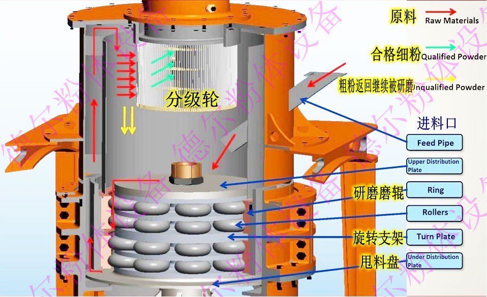 物料經(jīng)變頻給料機(jī)送入粉碎腔內(nèi),經(jīng)磨輥擠壓、剪切、研磨實(shí)現(xiàn)物料的超細(xì)粉碎。粉碎后的物料被上升的氣流輸送至分級(jí)區(qū),在分級(jí)輪離心力和風(fēng)機(jī)抽力的作用下,實(shí)現(xiàn)粗細(xì)粉的分離,達(dá)到細(xì)度的產(chǎn)品由收集器收集,粗顆粒返回粉碎腔再次粉磨,凈化的空氣由引風(fēng)機(jī)排出。