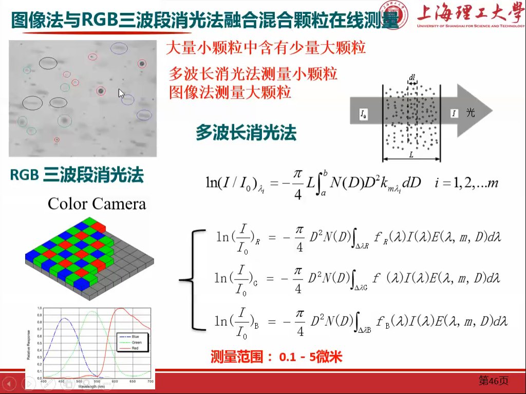 然后蔡小舒教授又介紹了納米顆粒原位在線測(cè)量,包括圖像動(dòng)態(tài)光散射法納米顆粒粒度測(cè)量,并用一些相關(guān)的實(shí)驗(yàn)研究數(shù)據(jù)進(jìn)行了詳細(xì)的說(shuō)明;之后他提出了光散射與圖像法融合在線測(cè)量方法,介紹了圖像法與RGB三波段消光法融合混合顆粒在線測(cè)量、側(cè)向光散射在線測(cè)量顆粒粒度和濃度原理和相關(guān)的一些實(shí)驗(yàn)數(shù)據(jù)。