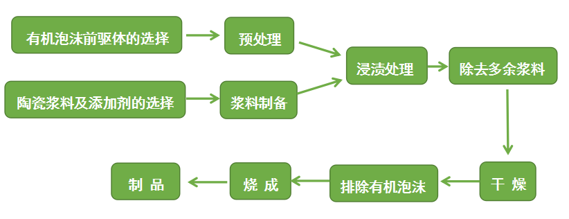 有機(jī)泡沫浸漬工藝的原理是利用可燃盡的有機(jī)泡沫(作為多孔載體)浸漬陶瓷漿料,干燥后,在高溫下燒盡有機(jī)泡沫而形成孔隙結(jié)構(gòu),也稱為模板法、前驅(qū)體法。
