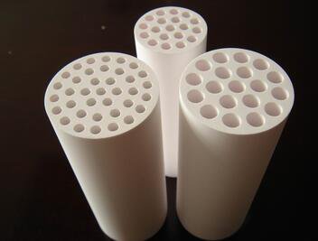 擠壓成型是將可塑性陶瓷原料通過(guò)設(shè)計(jì)好的多孔金屬模具擠壓成型,再燒結(jié)成多孔陶瓷的一種成型方法。形成的孔的外形為三角形、正方形、六邊形等形狀,直線貫通的宏觀尺寸的氣孔,截面尺寸常有幾個(gè)毫米大,類似蜂窩結(jié)構(gòu),因此也被稱為蜂窩陶瓷。