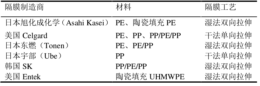 主要隔膜制造商