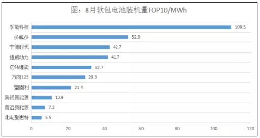 不過,孚能科技在8月強勢回歸。單就8月而論,孚能科技單月軟包電池裝機量達到109.5MWh,重回單月軟包電池裝機量第一,并遠遠領(lǐng)先于當月第二名多氟多的52.9的MWh。