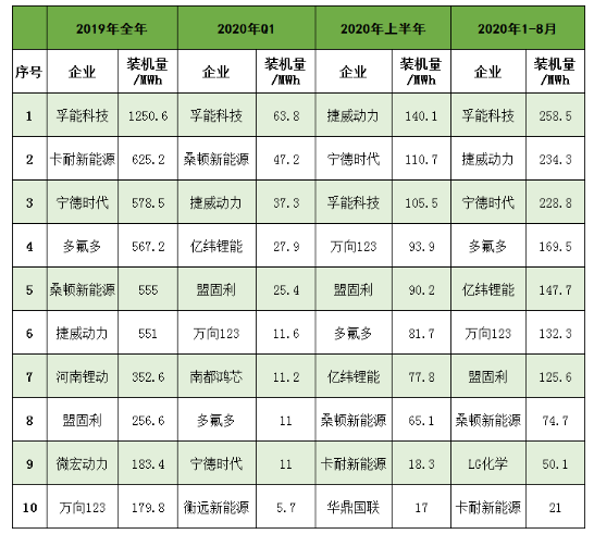 對比之下可發(fā)現(xiàn),2019年高居第二的卡耐新能源未上榜,河南鋰動、微宏等掉出前10,億緯鋰能、南都鴻芯、衡遠新能源新進入。