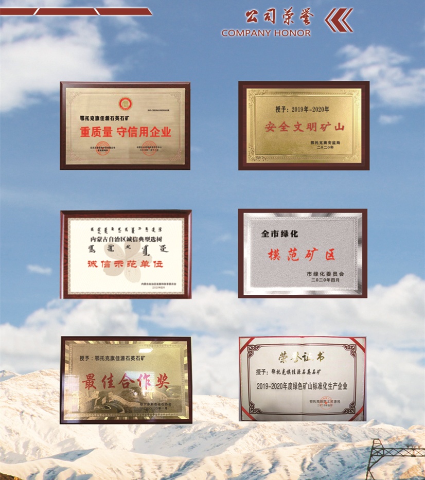 鄂托克旗佳源石英石礦,坐落在富饒的鄂爾多斯市鄂托克旗蒙西巴音溫都爾嘎查的千里山。本公司本著“綠水青山,就是金山銀山”的宗旨,合理開采,擁有高品質(zhì)的硅石礦源,公司總占地面積0.112平方公里,年產(chǎn)高品質(zhì)原礦石200萬噸。公司于2019年投資3000多萬。新引進一套1500x 1200顆式破碎機及其時屬設(shè)施,其二級破碎機為750x 1060顆式破碎機2臺,其產(chǎn)能在周邊三百公里內(nèi)無第二家。礦產(chǎn)硅含量高.適合冶金工業(yè),玻璃工業(yè)、建筑工業(yè)、化學(xué)工業(yè),廠廣泛用于石油、陶瓷、機械冶金、鑄造.建材等部門。主要產(chǎn)品分幾種規(guī)格1 : 0.2CM- -1.3CM碳化硅產(chǎn)品。2:1CM- -3CM. 3 : 3CM- -8CM河道渣料。4: 6CM- -12CM冶金硅。5 : 8CM- -14CM冶金硅。6: 8CM- -16CM冶金硅。7 : 9CM- -18CM冶金硅石塊。