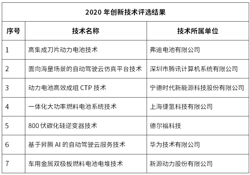 在“全球新能源汽車前沿及創(chuàng)新技術(shù)”評選中,“創(chuàng)新技術(shù)”是指在新能源汽車領(lǐng)域中創(chuàng)造出的一種新技術(shù),可解決新能源汽車關(guān)鍵核心領(lǐng)域技術(shù)難點、技術(shù)瓶頸的重要應(yīng)用性技術(shù)。參評的創(chuàng)新技術(shù)需在產(chǎn)品上得到實際應(yīng)用,產(chǎn)品形態(tài)為投放市場。以下為此次評選結(jié)果: