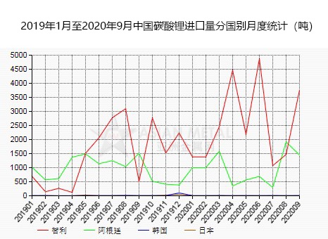 如下圖所示,2020年9月份中國(guó)從智利進(jìn)口3,755噸碳酸鋰,環(huán)比增加155.8%,同比上升6.5倍;從阿根廷進(jìn)口1,451噸碳酸鋰,環(huán)比減少24.3%,同比走低3.9%;從韓國(guó)進(jìn)口9噸碳酸鋰,環(huán)比走高28.6%,同比持平。