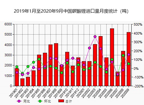 中國(guó)粉體網(wǎng)訊 據(jù)中國(guó)海關(guān)統(tǒng)計(jì),2020年9月份中國(guó)共進(jìn)口5,217噸碳酸鋰,環(huán)比上升53.7%,同比增加157.2%。
