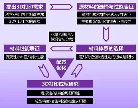 針對(duì)不同3D打印工藝和應(yīng)用場(chǎng)景需求,開發(fā)各種性能穩(wěn)定且打印質(zhì)量可靠的材料。研究所目前主要集中在有機(jī)物高分子、各類復(fù)合陶瓷懸浮液/漿料材料等方面的研究。總體材料開發(fā)和配制路線方案為: