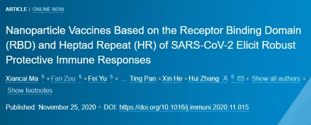 中國(guó)粉體網(wǎng)訊 11月25日,國(guó)際頂級(jí)免疫學(xué)期刊《Immunity》刊發(fā)了中山大學(xué)人類(lèi)病毒學(xué)研究所教授張輝課題組開(kāi)發(fā)針對(duì)新冠病毒的新型納米顆粒疫苗的最新成果, “Nanoparticle Vaccines Basedon the Receptor Binding Domain (RBD) and Heptad Repeat (HR) of SARS-CoV-2Elicit Robust Protective Immune Responses”。