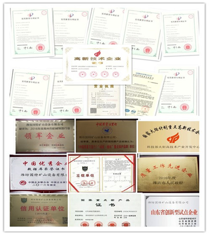 濰坊國特礦山設(shè)備有限公司公司總部坐落于工業(yè)發(fā)達(dá)的山東省青州市經(jīng)濟(jì)開發(fā)區(qū),占地面積40000平方米,是國家高新技術(shù)企業(yè),公司產(chǎn)品先后通過ISO9001質(zhì)量體系認(rèn)證、環(huán)境體系認(rèn)證、安全管理體系認(rèn)證、歐盟ce認(rèn)證、擁有國家專利幾十項(xiàng)。產(chǎn)品遠(yuǎn)銷海外多個(gè)國家,為客戶提供成套設(shè)備生產(chǎn)線及技術(shù)服務(wù)。
