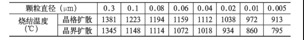 表一:粉體顆粒尺寸與燒結(jié)溫度的關(guān)系(燒結(jié)擴(kuò)散活化能Q=418KJ/mol)