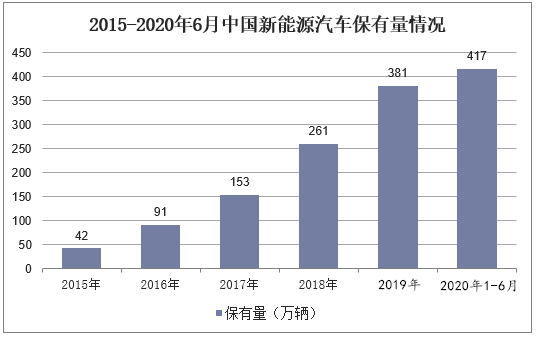 截至2020年6月,我國新能源汽車保有量417萬輛,相比2019年的381萬輛,新能源汽車保有量增加了36萬輛。