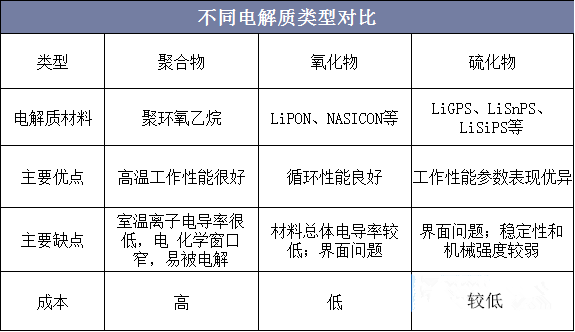 固態(tài)電池相較于傳統(tǒng)鋰電池,有著更為優(yōu)異的性能,固態(tài)鋰電池的安全性極高,無自燃、爆炸風險;能量密度高,有望解決傳統(tǒng)鋰電池的續(xù)航里程問題;可實現(xiàn)快充。目前固態(tài)鋰電池的電解質(zhì)有三種:聚合物電解質(zhì)、硫化物電解質(zhì)和氧化物電解質(zhì),有的已經(jīng)在小規(guī)模使用或接近商業(yè)化,有的還在完善過程中。