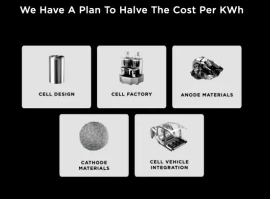 2020年特斯拉的「電池日」,宣布了從電芯設(shè)計、電芯生產(chǎn)工藝、硅負(fù)極材料、高鎳正極材料、電芯車輛集成化5各方面開發(fā)電池,最終,馬斯克認(rèn)為這個方案能使電池成本減少56%,續(xù)航里程增加54%,單位投資額減少69%。