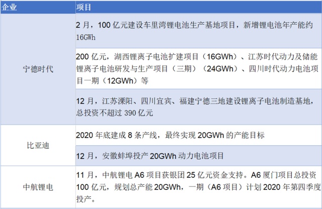 2020年部分電池企業(yè)的擴(kuò)產(chǎn)情況