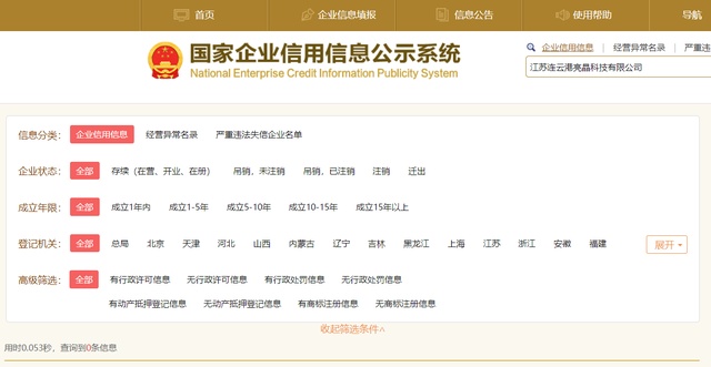通過國家企業(yè)信用信息公示系統(tǒng),并未查詢到“江蘇連云港亮晶科技有限公司”與“連云港亮晶科技有限公司”。