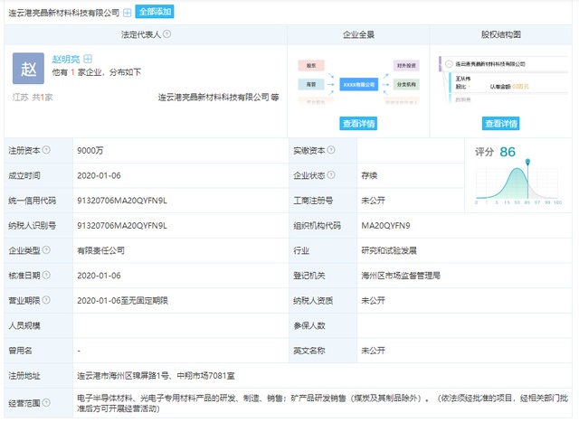 天眼查顯示,連云港亮晶新材料科技有限公司成立于2020年1月,注冊資本9000萬,經(jīng)營范圍包括,電子半導(dǎo)體材料、光電子專用材料產(chǎn)品的研發(fā)、制造、銷售;礦產(chǎn)品研發(fā)銷售(煤炭及其制品除外)。